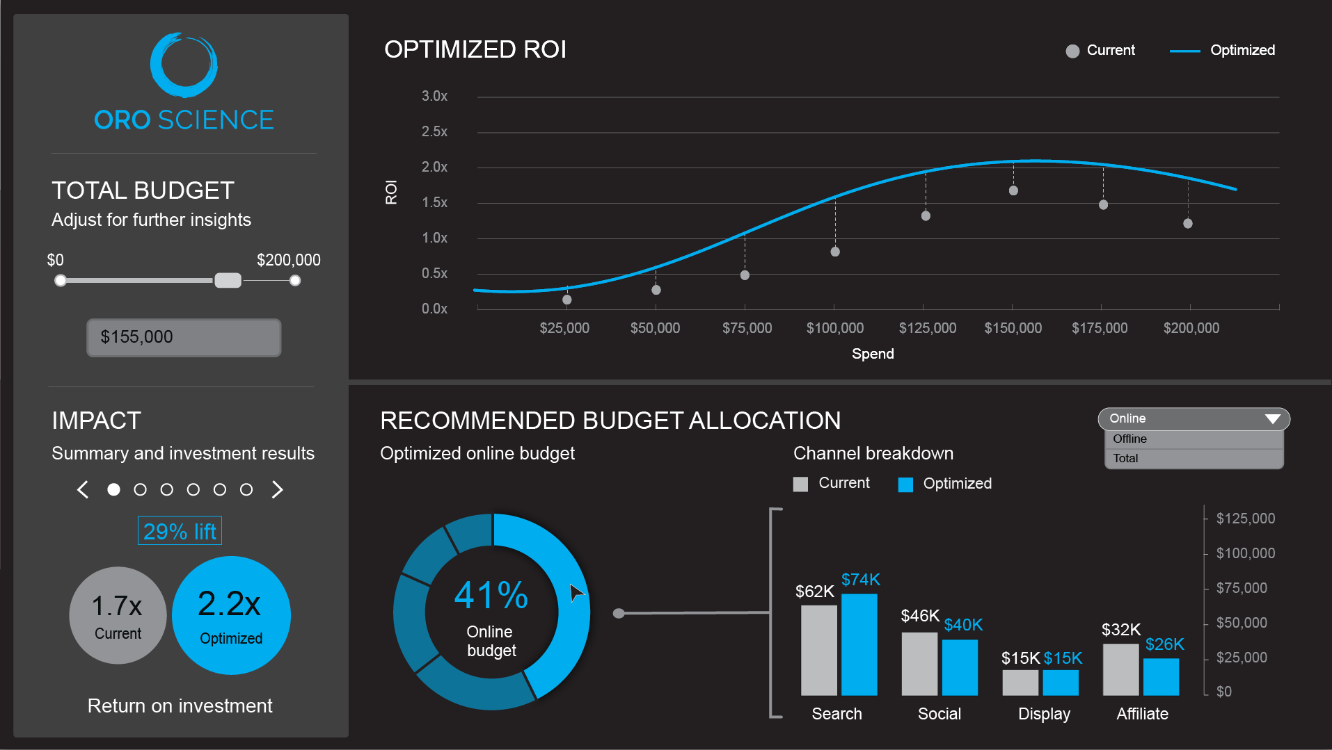 The leadership at Oro Science asked me to design a mock up of their upcoming marketing analytics platform. This project was an ongoing collaboration between the CEO, the Chief Data Scientist and I. This was a fun and challenging project that really tested my ability to find a clean, modern layout that could also present a lot of important information for the user.